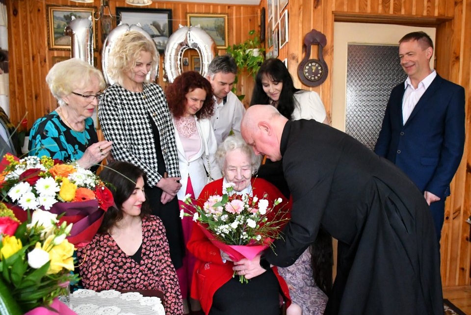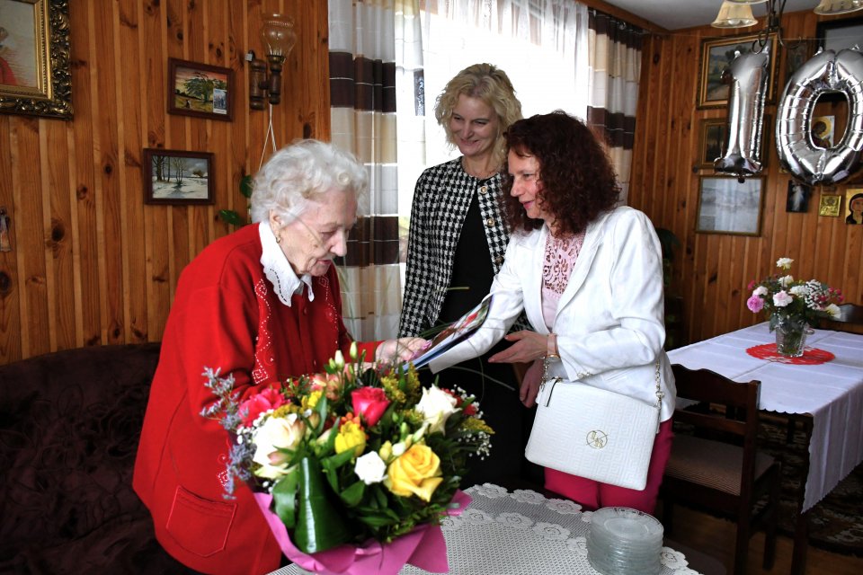 Z tej okazji p. Beata Suwała-Szczechowska - Zastępca Burmistrza, p. Grażyna Markowicz - Kierownik Urzędu Stanu Cywilnego w Rymanowie oraz ks. Marek Zajdel - Proboszcz Parafii w Rymanowie-Zdroju odwiedzili Jubilatkę, aby złożyć jej najserdeczniejsze życzenia.
