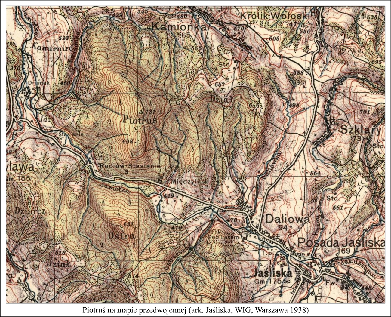 W okresie międzywojennym po wschodniej stronie przełęczy (527 m) między Piotrusiem a Działem Kamiańskim stała gajówka. Z Daliowej prowadziła do niej tzw. Wierchowa Puć (w gwarach łemkowskich słowo puć znaczy ‘droga’). Obecnie w podobny sposób biegnie wspomniana leśna droga asfaltowa z Obłazu do Zawadki Rymanowskiej. Pan Michał Krupej opowiadał, że teren w pobliżu gajówki nazywano Koło Adama, gdyż ostatnim gajowym był niejaki Adam Szałaj z Posady Jaśliskiej.